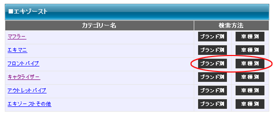 | 検索方法をお選びください。 「ブランド別」ではご希望のブランドより商品をお選び頂けます。「STEP 3」へ 「車種別」はご希望の車種より商品を検索します。下記をご参照の上「STEP 5」へ |