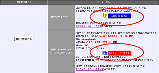 | 当サイトで初めてご購入される方は「初めて注文する」ボタンをクリックしてください。 2回目以上の方は「ログインして注文する」ボタンをクリックするとログインのダイアログが表示されますので 前回ご注文された時のE-Mailアドレスを「ユーザー名」欄に 例:foo@example.co.jp 設定されたパスワードを「パスワード」欄に 例:abc12345 ご記入後、ログインしてください ログイン後、「メンバー用カート」画面が表示されます。 またご利用可能ポイントが表示されますのでご利用ポイントを設定して頂けます。 |