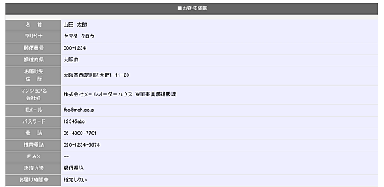 | 「お客様情報」で入力頂いた「E-Mail」アドレス宛にご注文内容をメール自動配信します。 なお、5日を経過してもメールが届かない場合はお手数ですがお申し出ください。 ※ご注文後の流れはこちらをご覧ください。 |